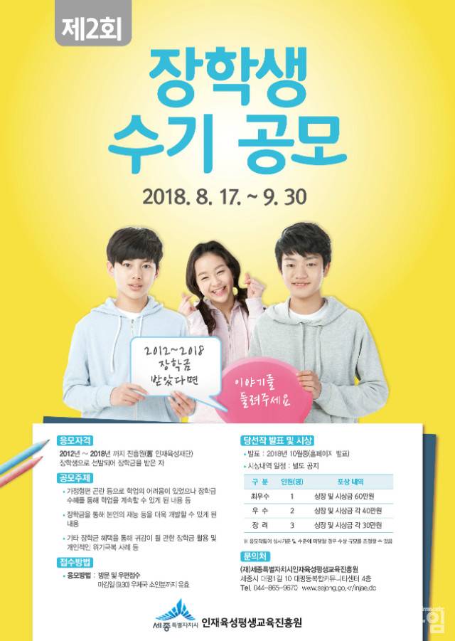 [굿타임] = 이강부 기자 = 세종시 인재육성평생교육진흥원은 지난 2012년 이래 선발돼 장학금 수혜를 받은 장학생을 대상으로 제2회 장학생 수기 공모전을 개최한다.