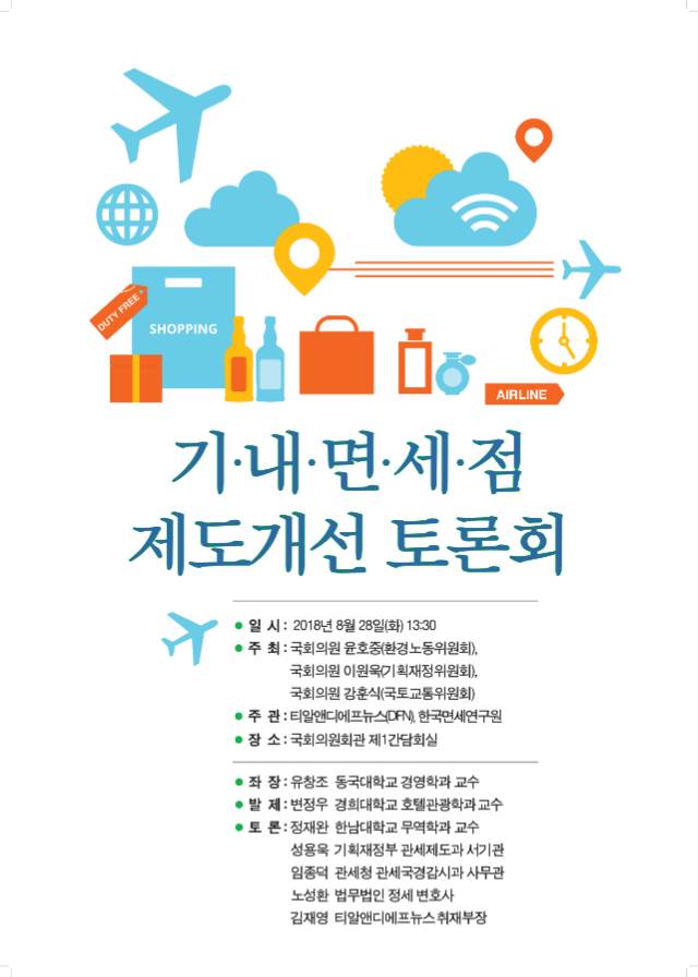 이번 토론회는 면세점제도개선 TF 위원장 출신 유창조 동국대 교수가 좌장을 맡아 진행하며 면세점제도개선 TF팀 위원 출신인 변정우 경희대 교수가 발제를 맡아 기내면세점 제도개선 방안을 제시할 계획이며 토론자로 정재완 한남대 교수, 성용욱 기획재정부 관세제도과 서기관, 임종덕 관세청 관세국경감시과 사무관, 노성환 법무법인 정세 변호사, 김재영 티알앤디에프뉴스 취재부장이 나선다.